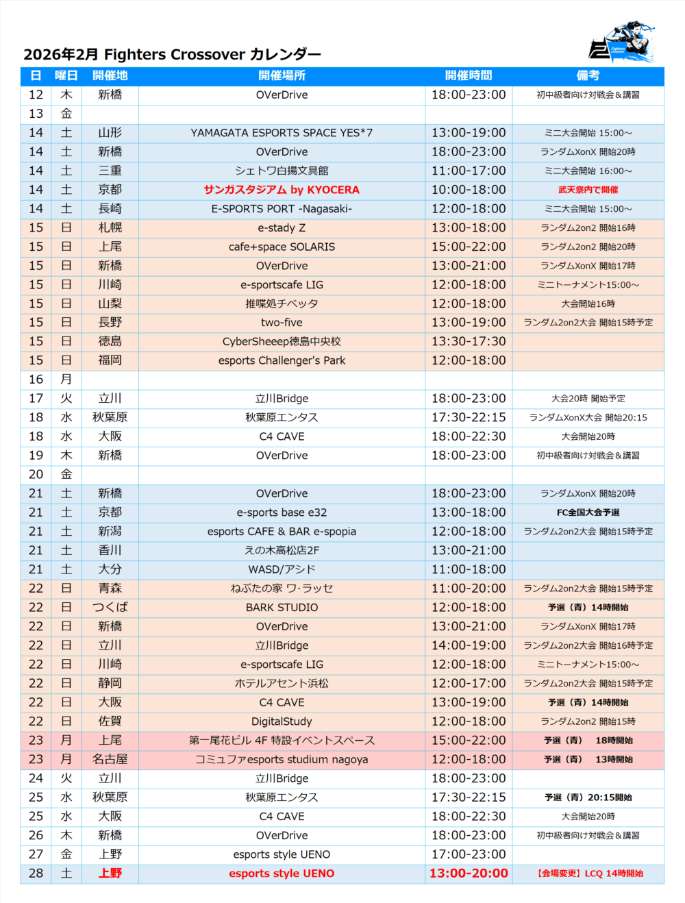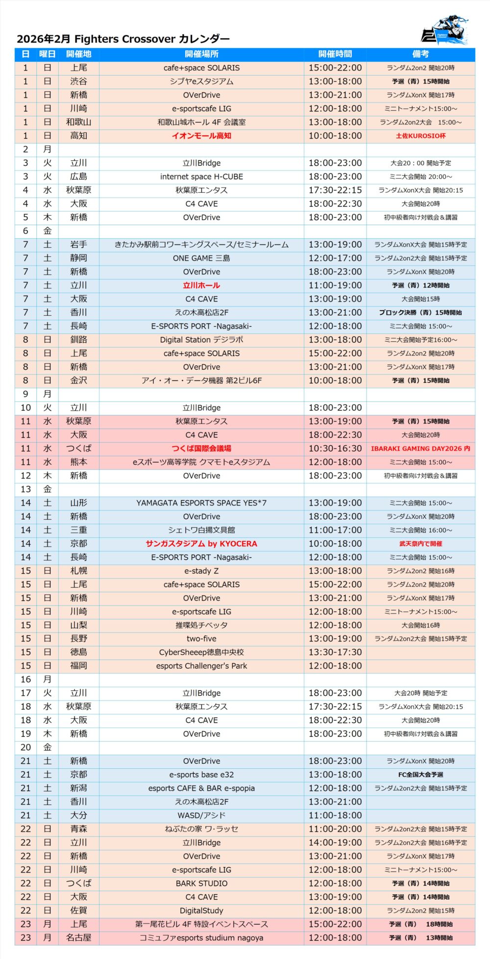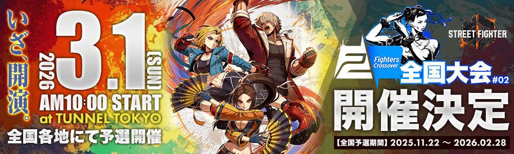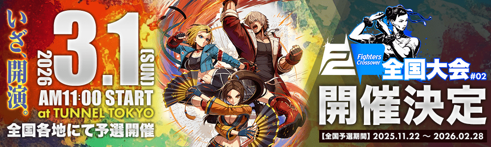 Fighters Crossover 全国大会#02の開催が決定いたしました。2026.03.01に行われる決勝大会に向けて全国各地で予選を行ないますのでぜひご参加ください!