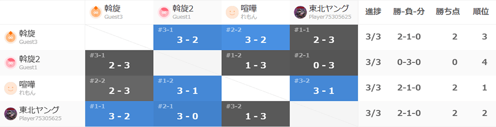 最年少のKOTARO選手はチーム「あっせん2」相手に3タテを決めるなど、チーム名通りの若さを見せつけていきます。そんな「東北ヤング」と肩を並べるようにポイントを稼いできたのは、秋田の兄貴分れもん選手が率いるチーム「喧嘩」。最終戦はポイントが同率となったこの2チームで実質的な決勝戦を行いました。