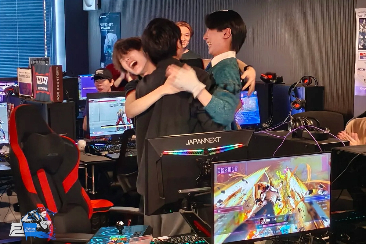 咆哮、その直後にアヤサカ選手・れ〜げん選手が飛び出し、3人は熱い抱擁を交わします。