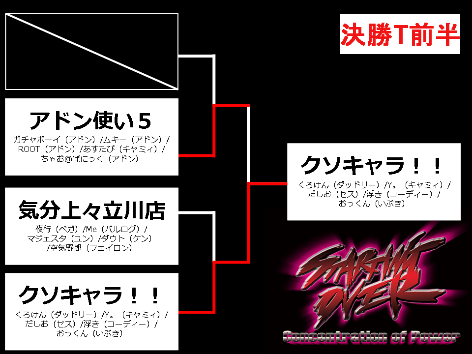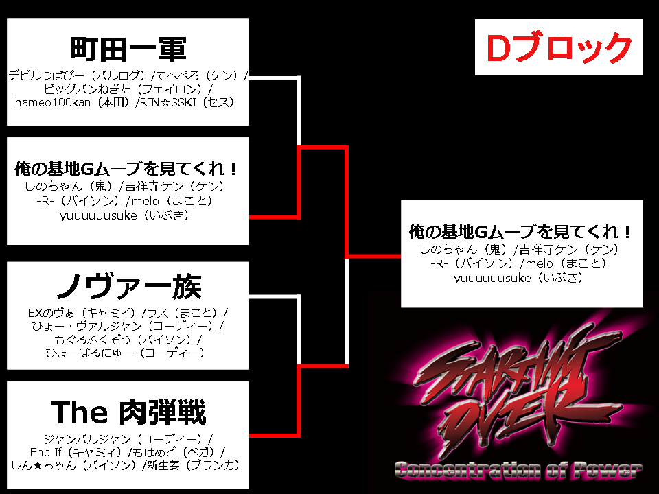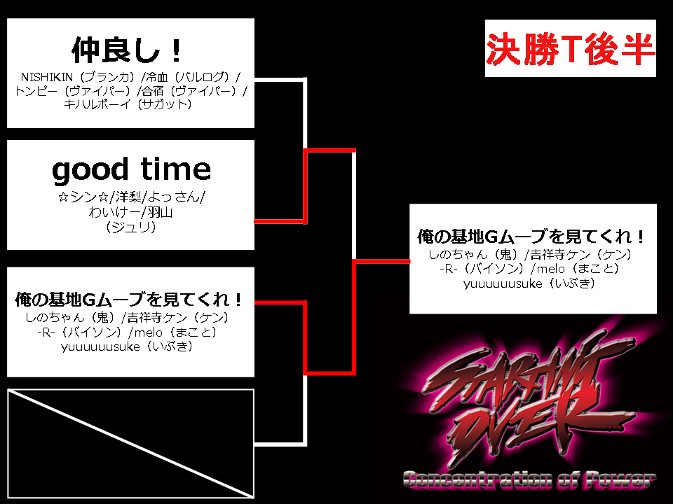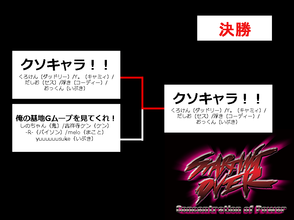 2012/05/05ゲームイベント STARTING OVER ~Concentration of Power~ 5on5結果 参加チーム23チーム。 たくさんの参加、ご視聴ありがとうございました。 動画 2012.05.05 STARTING OVER 後夜祭5on5 準決勝第一試合 2012.05.05 STARTING OVER 後夜祭5on5 準決勝第二試合 2012.05.05 STARTING OVER 後夜祭5on5 決勝戦 前の記事へ 次の記事へ