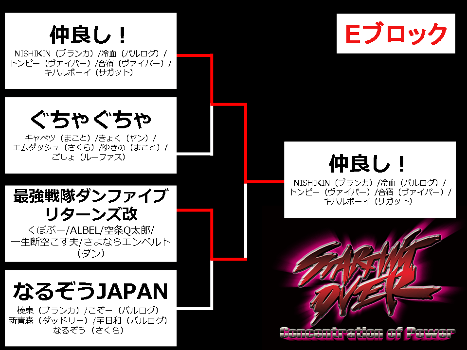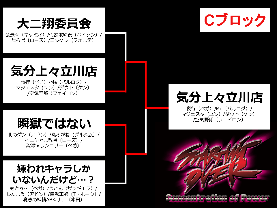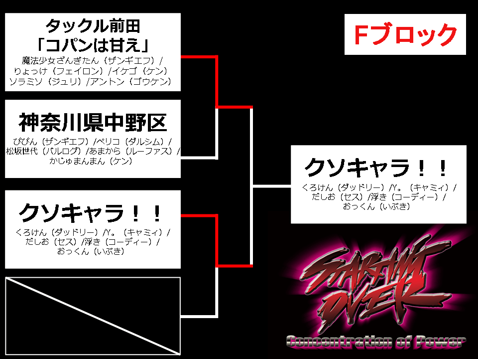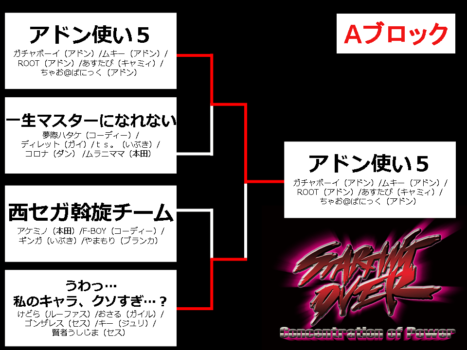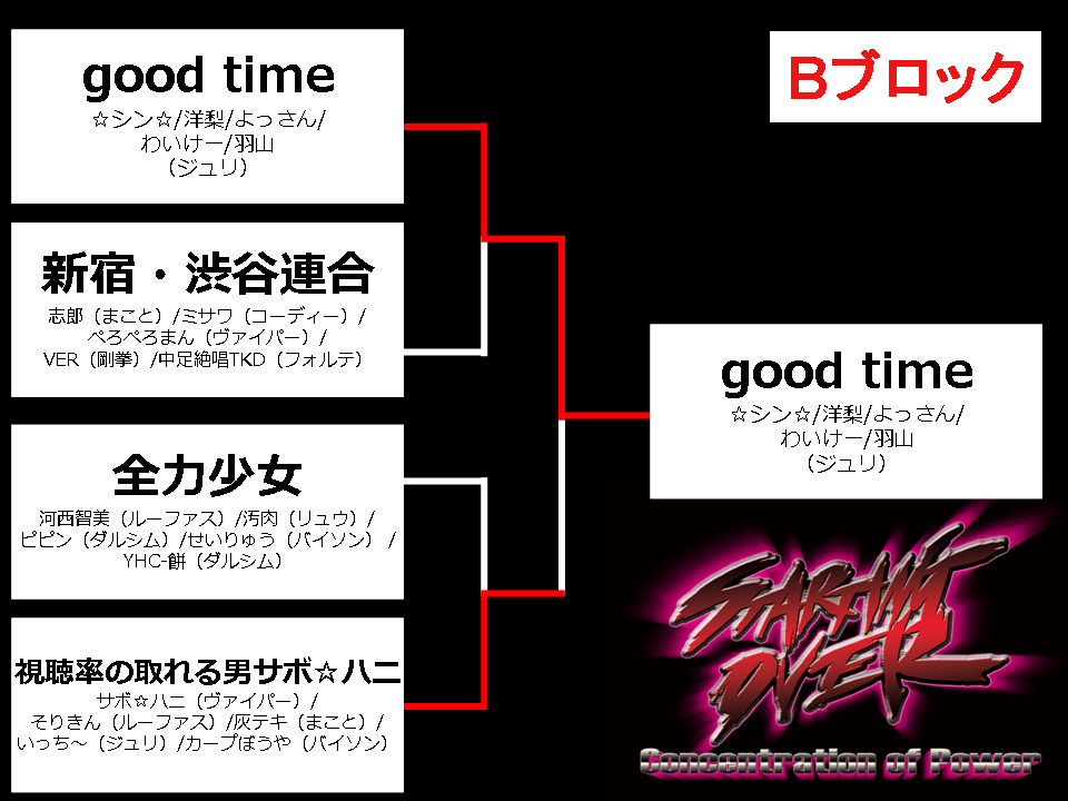 2012/05/05ゲームイベント STARTING OVER ~Concentration of Power~ 5on5結果 参加チーム23チーム。 たくさんの参加、ご視聴ありがとうございました。 動画 2012.05.05 STARTING OVER 後夜祭5on5 準決勝第一試合 2012.05.05 STARTING OVER 後夜祭5on5 準決勝第二試合 2012.05.05 STARTING OVER 後夜祭5on5 決勝戦 前の記事へ 次の記事へ