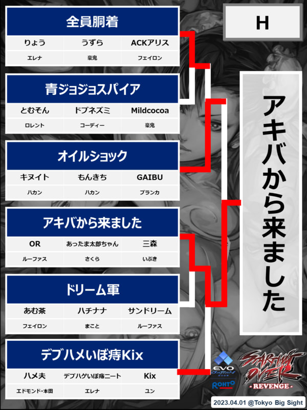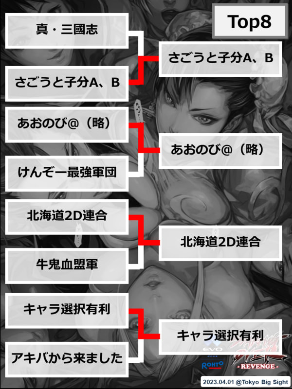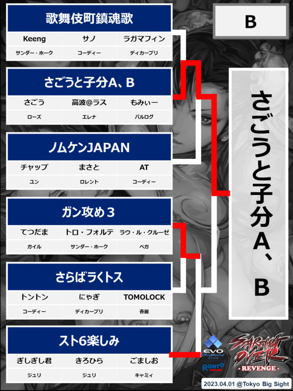 ■大会形式:3on3。同キャラあり。勝ち抜き。先鋒申告制。キャラ固定。シングルトーナメント。斡旋あり。