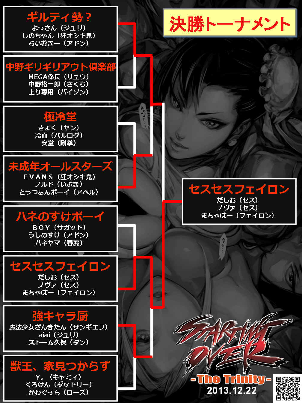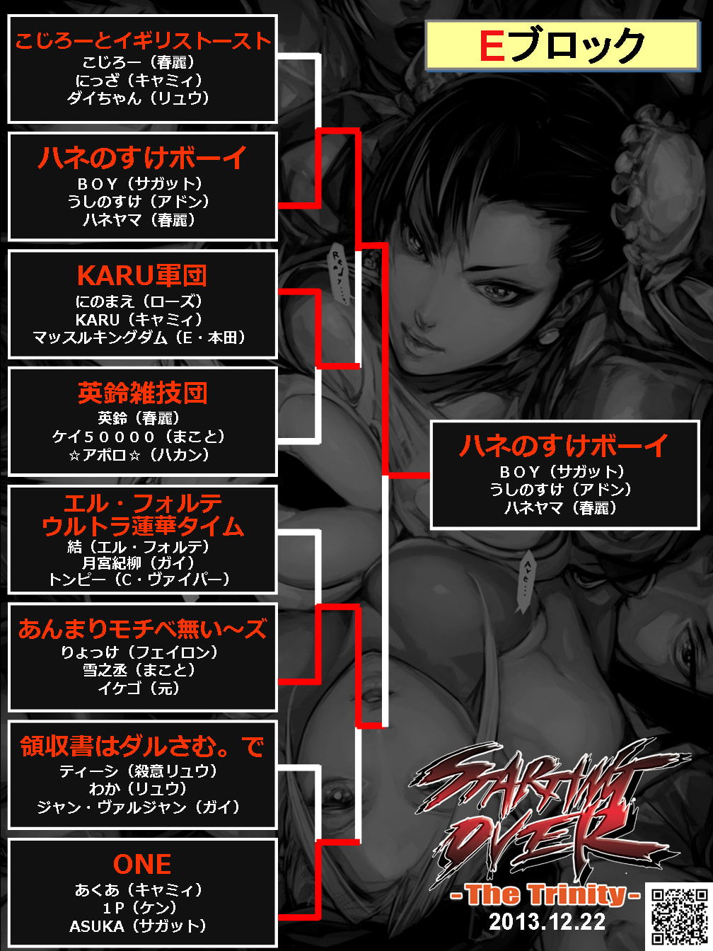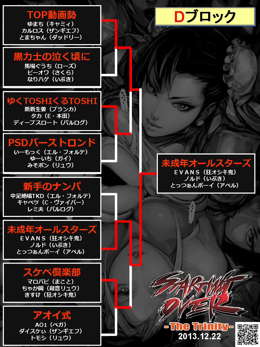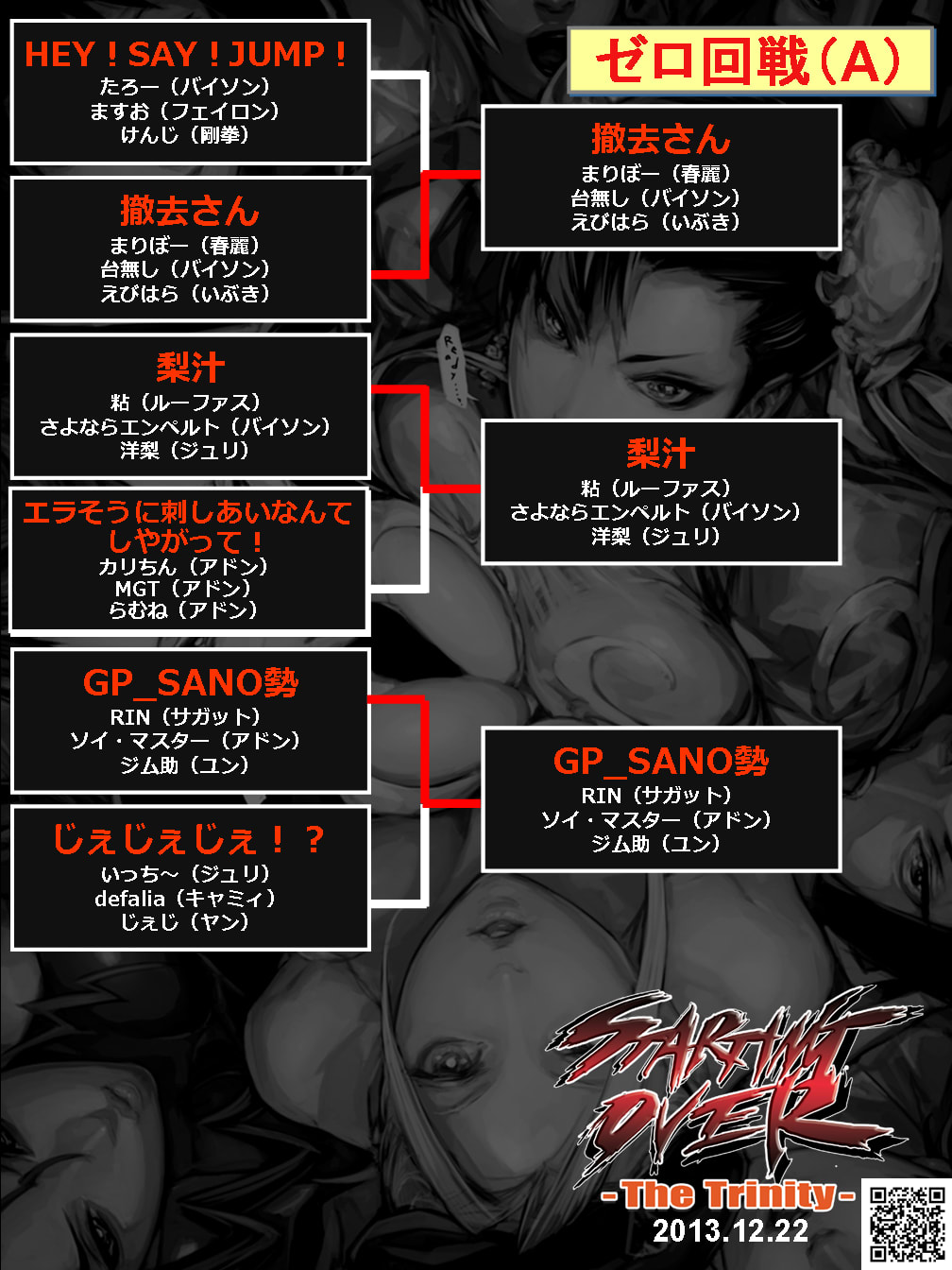 2013/12/23ゲームイベント 2013.12.22 STARTING OVER -The Trinity- トーナメント表 大会詳細はコチラ エントリーリストはコチラ 配信URLはコチラ ■決勝トーナメント表 ■トーナメント表(本戦) ■トーナメント表(ゼロ回戦) 前の記事へ 次の記事へ
