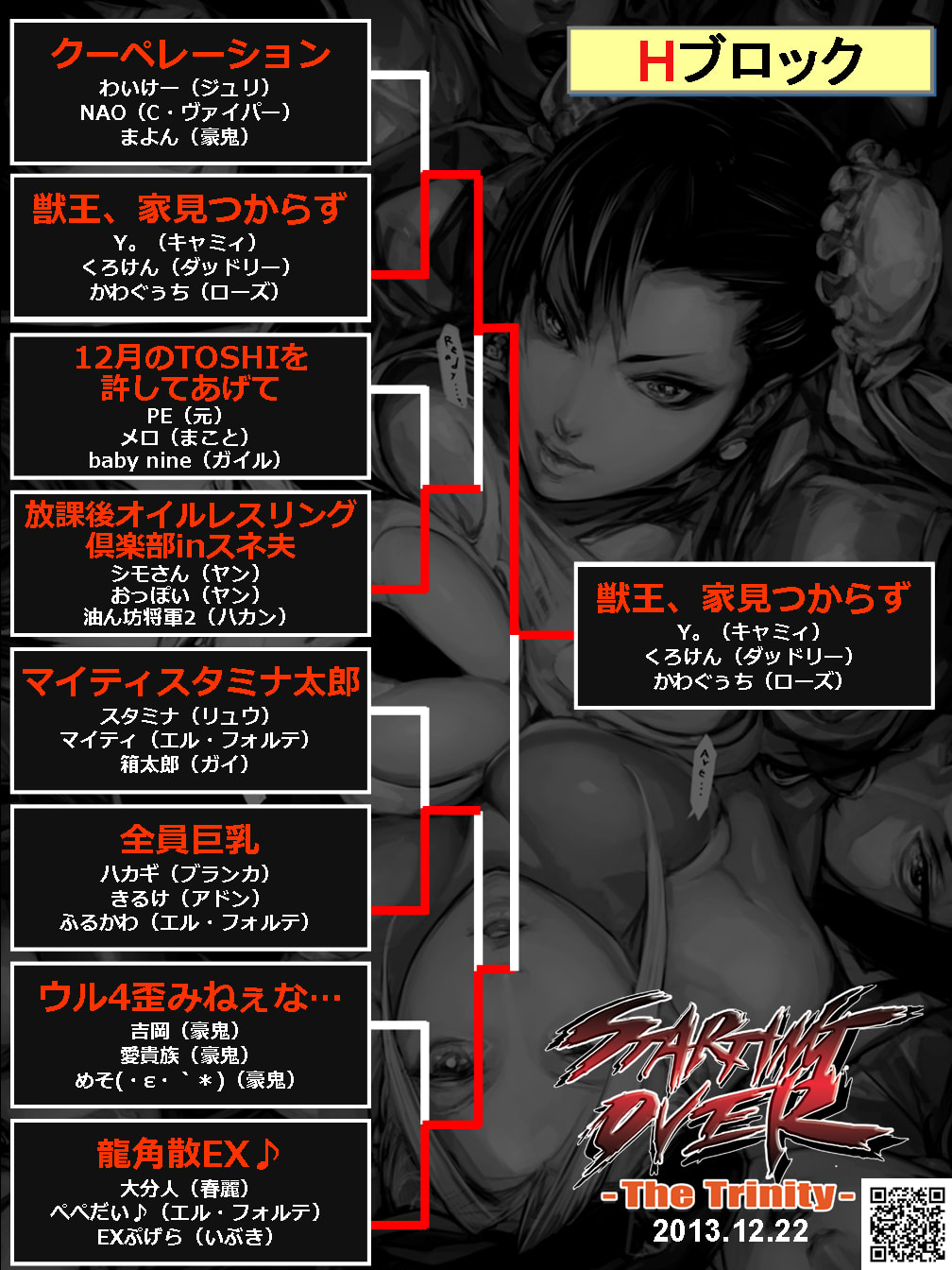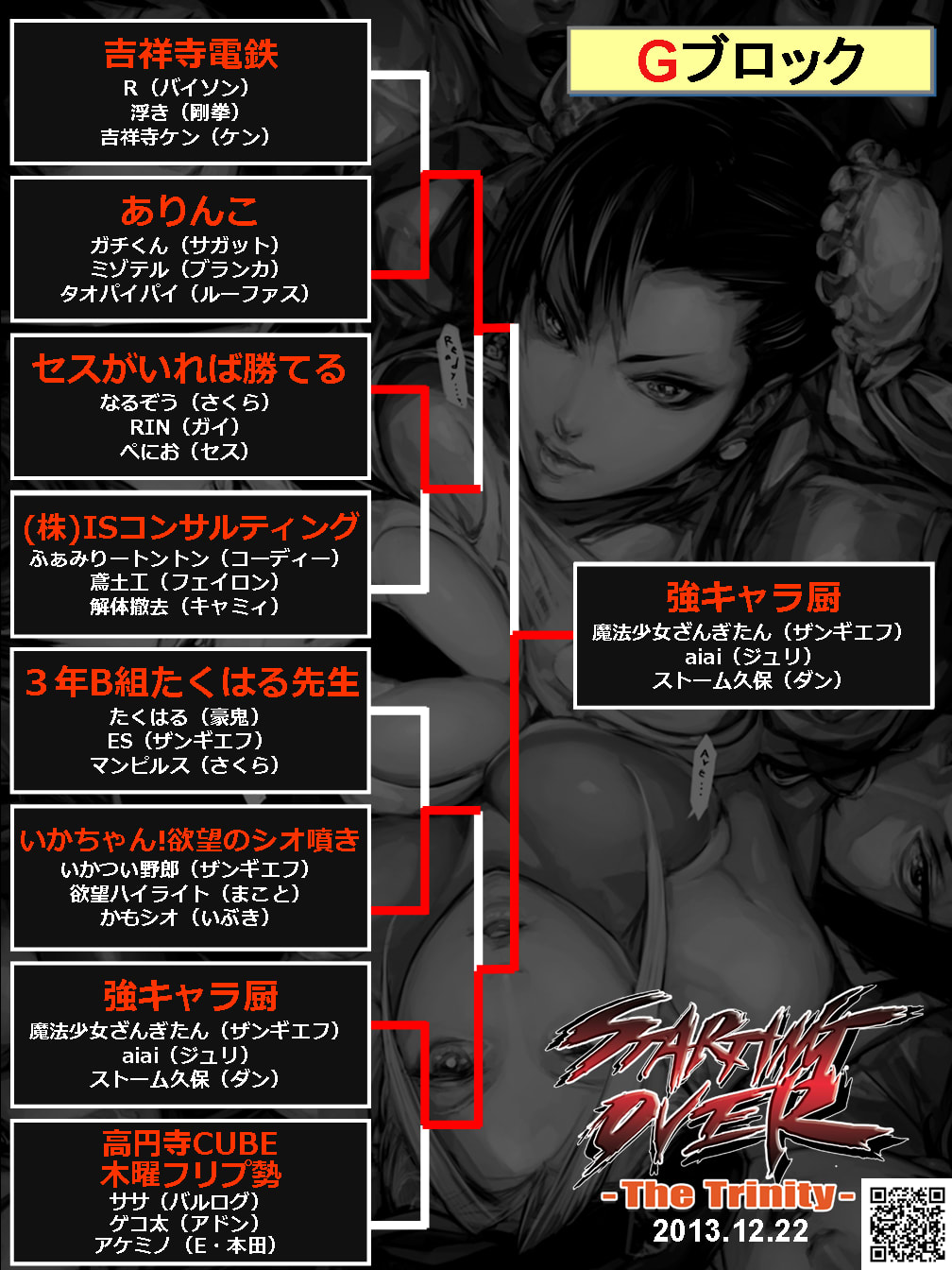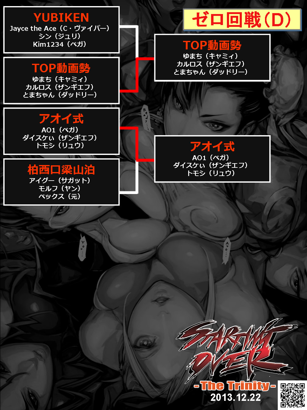 2013/12/23ゲームイベント 2013.12.22 STARTING OVER -The Trinity- トーナメント表 大会詳細はコチラ エントリーリストはコチラ 配信URLはコチラ ■決勝トーナメント表 ■トーナメント表(本戦) ■トーナメント表(ゼロ回戦) 前の記事へ 次の記事へ