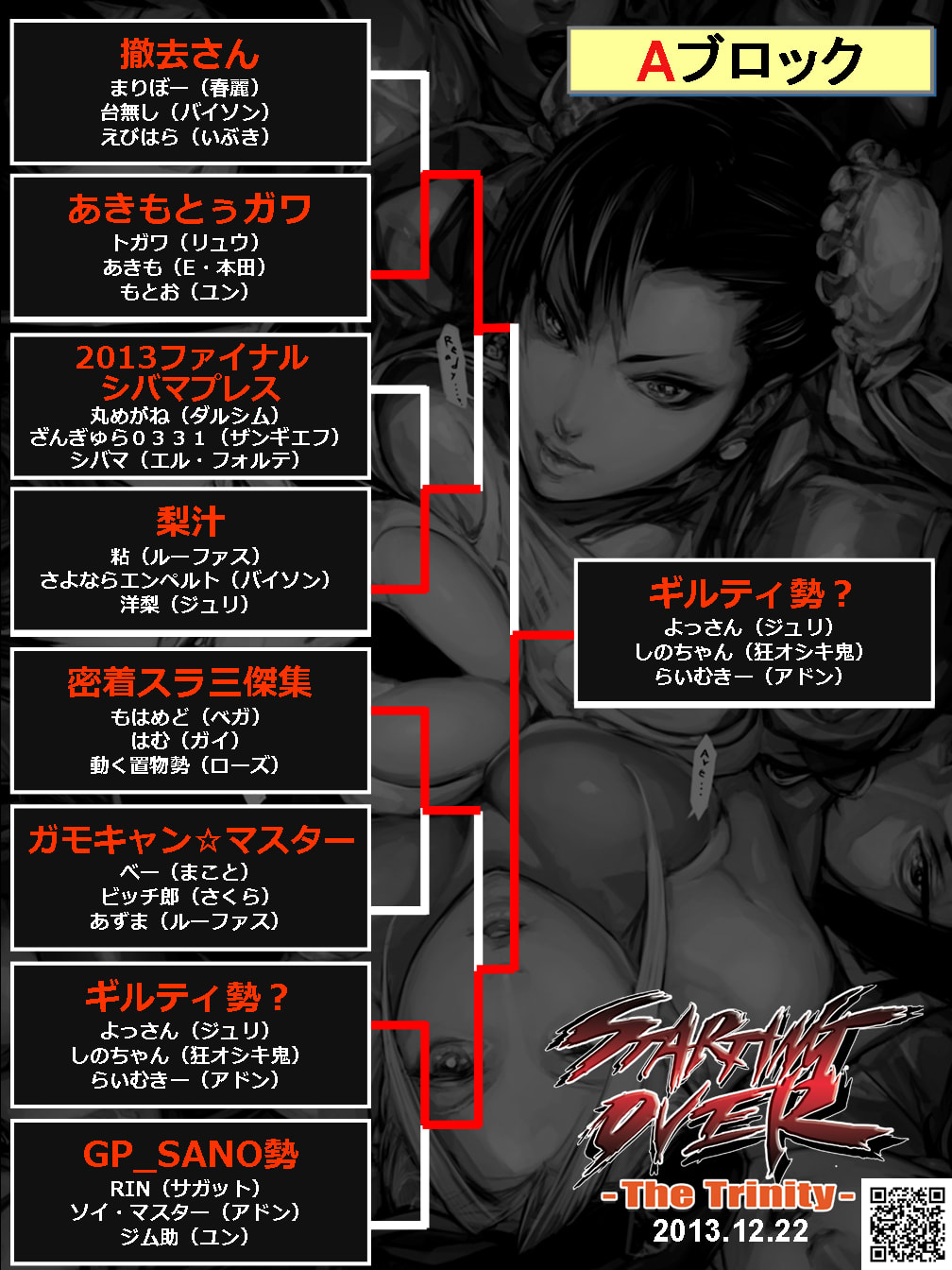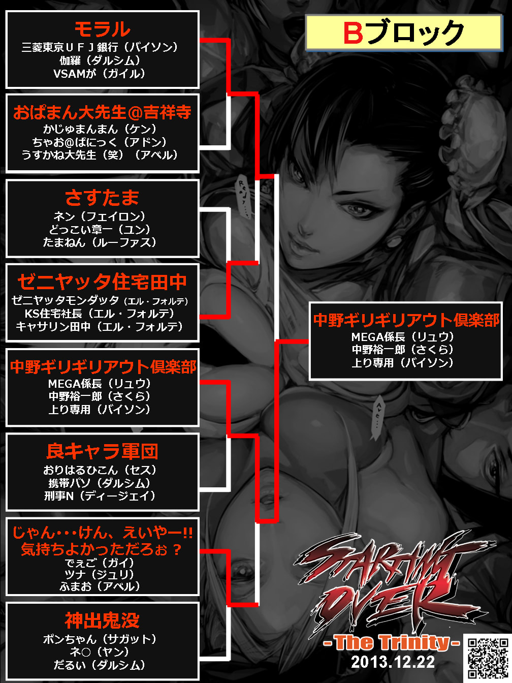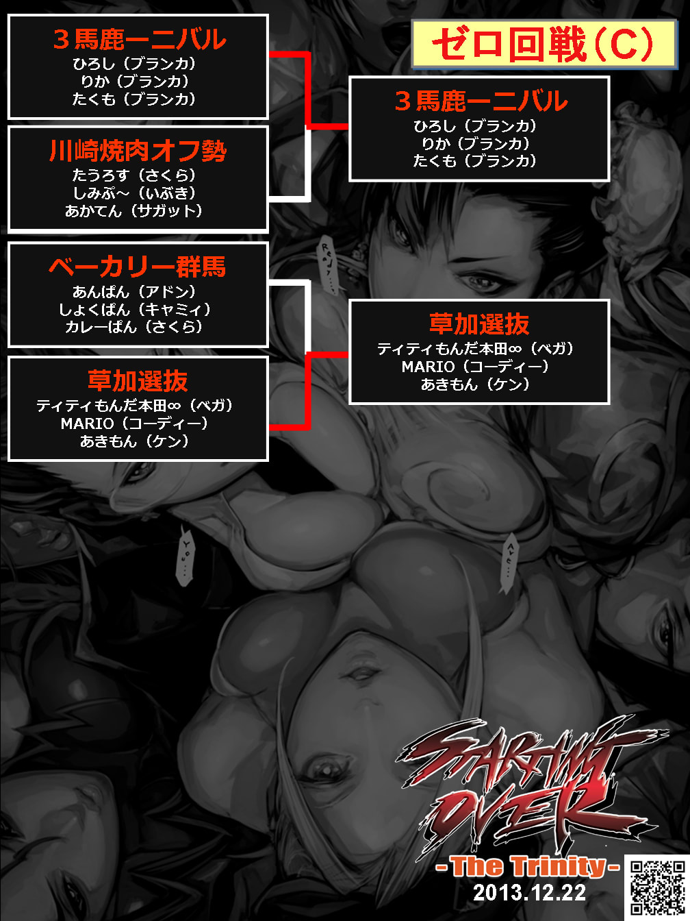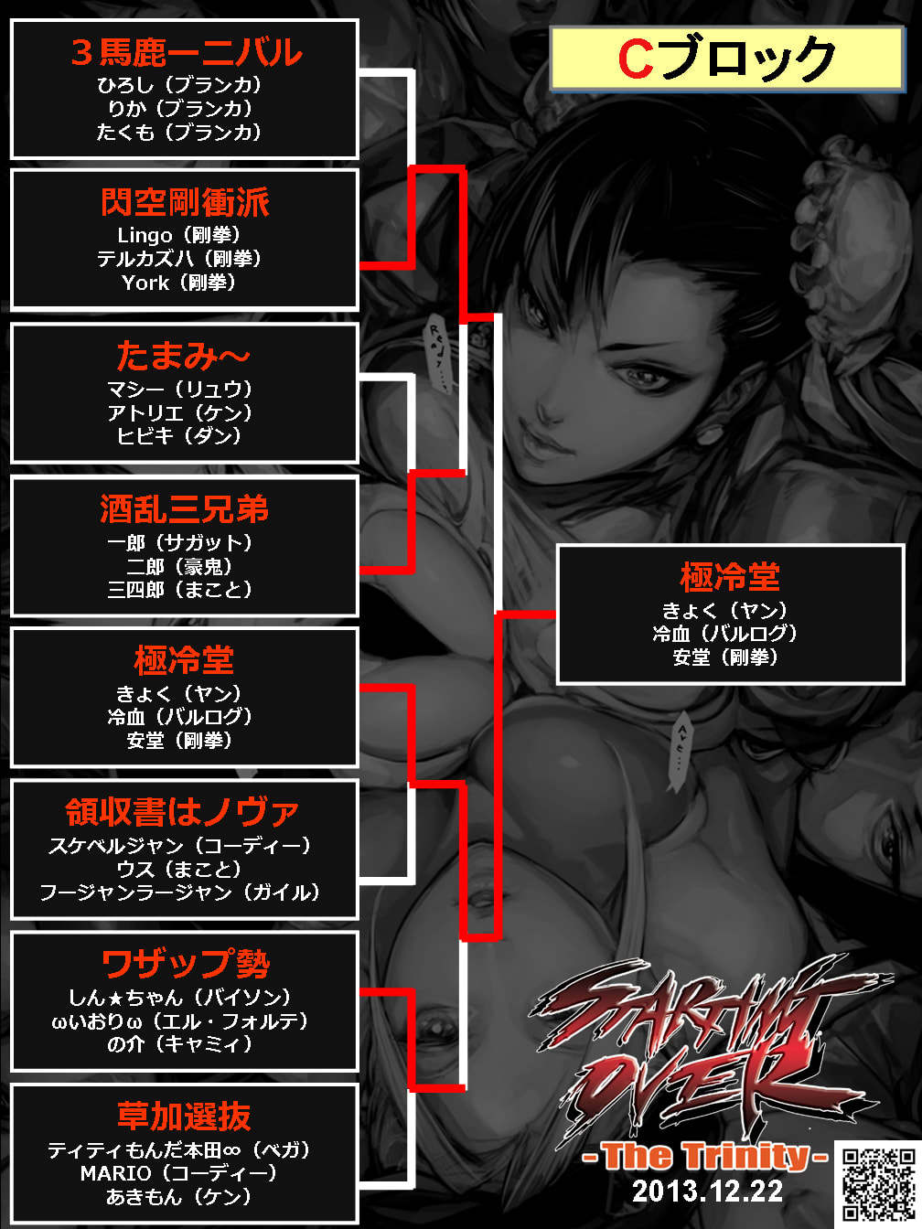 2013/12/23ゲームイベント 2013.12.22 STARTING OVER -The Trinity- トーナメント表 大会詳細はコチラ エントリーリストはコチラ 配信URLはコチラ ■決勝トーナメント表 ■トーナメント表(本戦) ■トーナメント表(ゼロ回戦) 前の記事へ 次の記事へ
