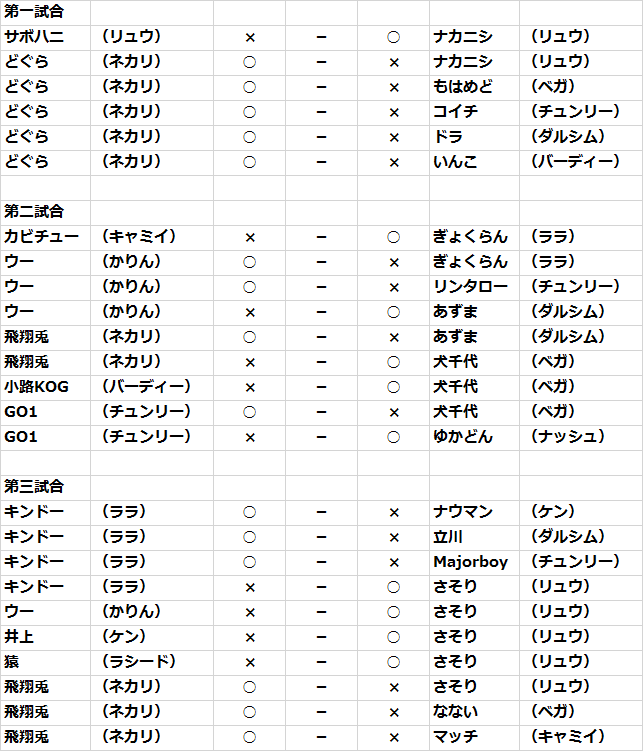 【東】ドラ(ダルシム) /コイチ(チュンリー) /いんこ(バーディー) /もはめど(ベガ) /ナカニシ(リュウ)