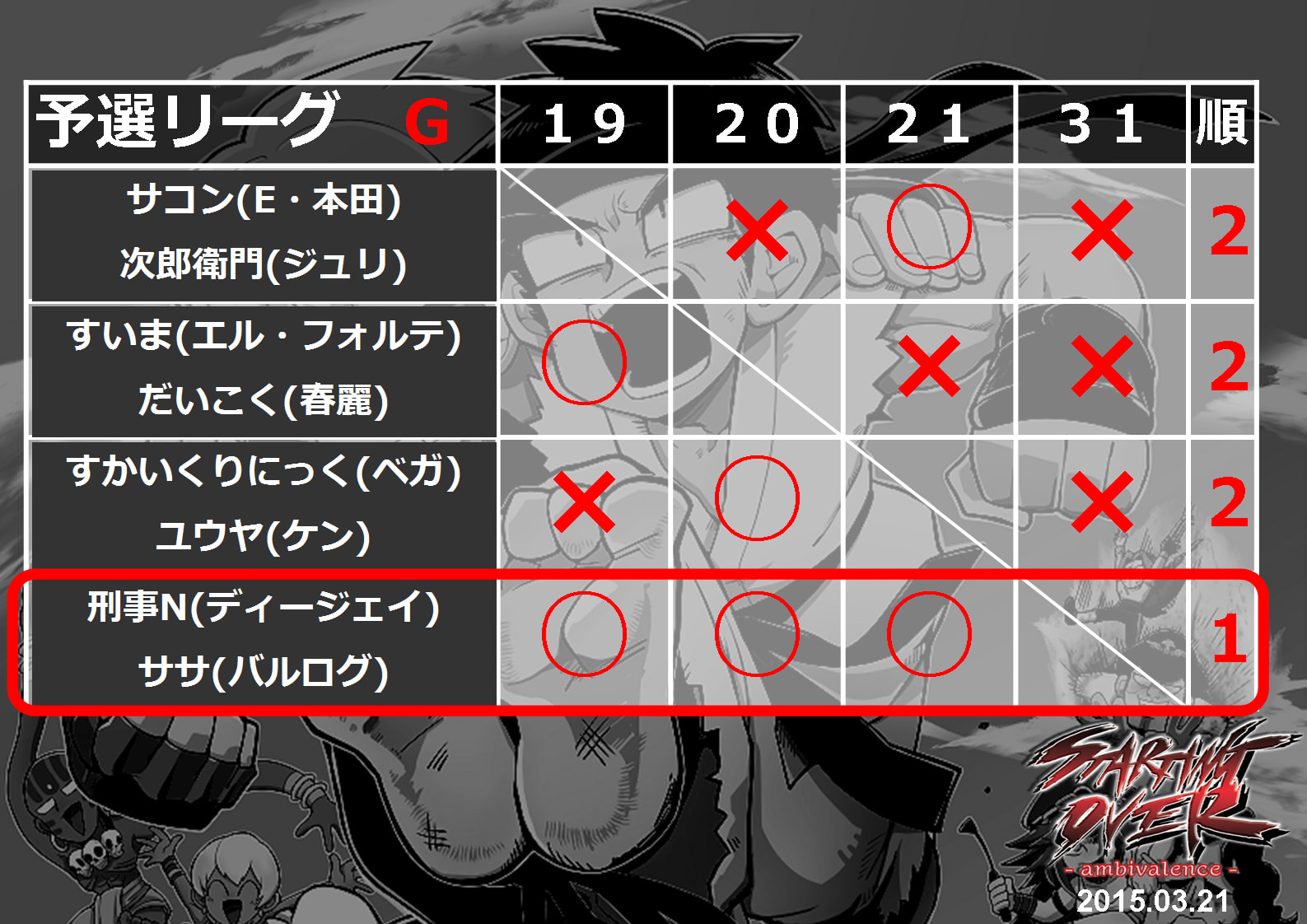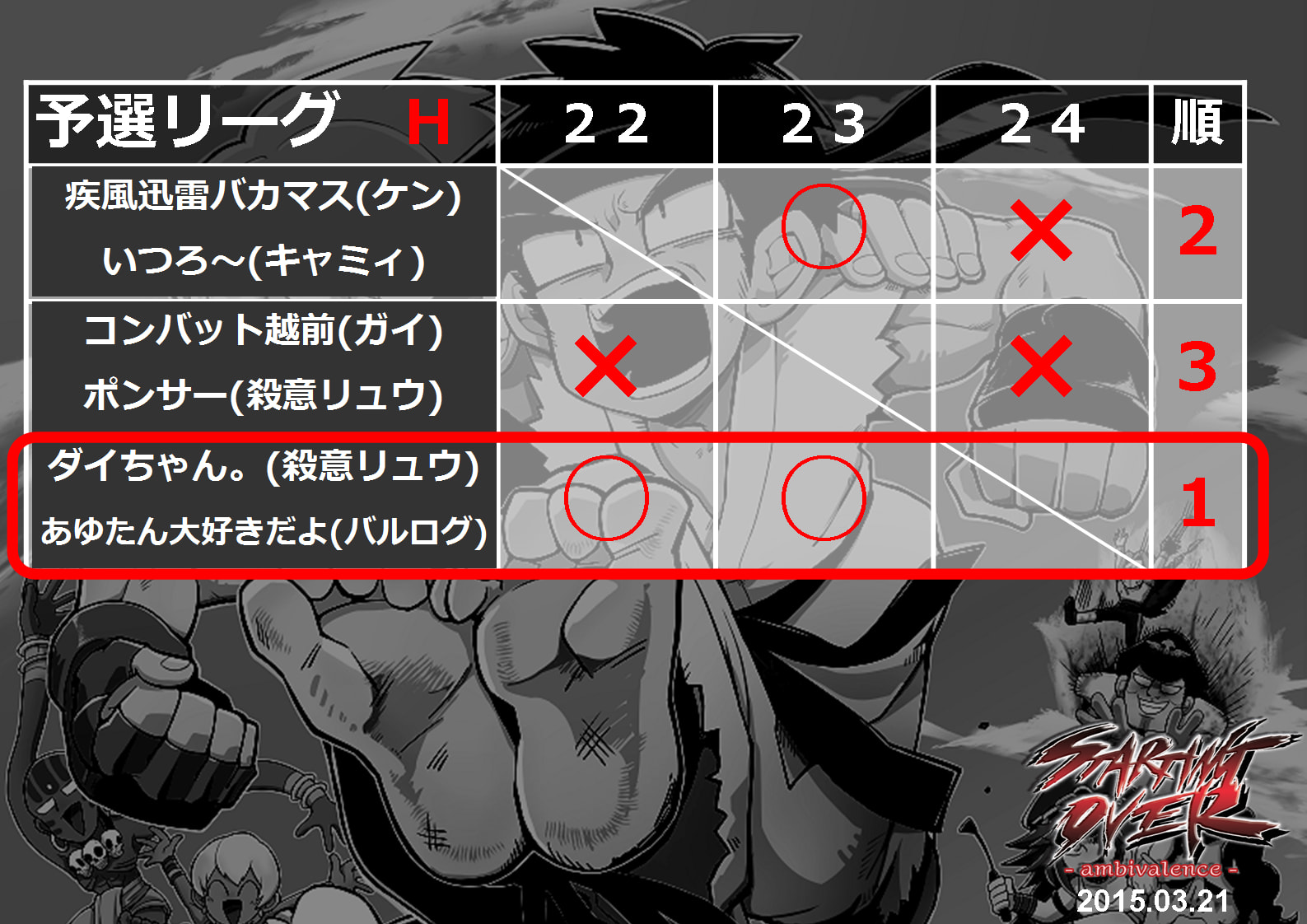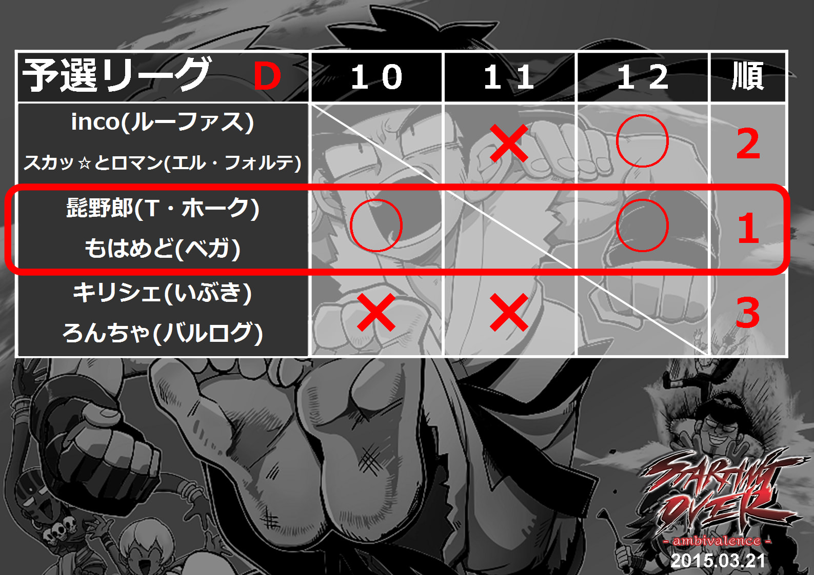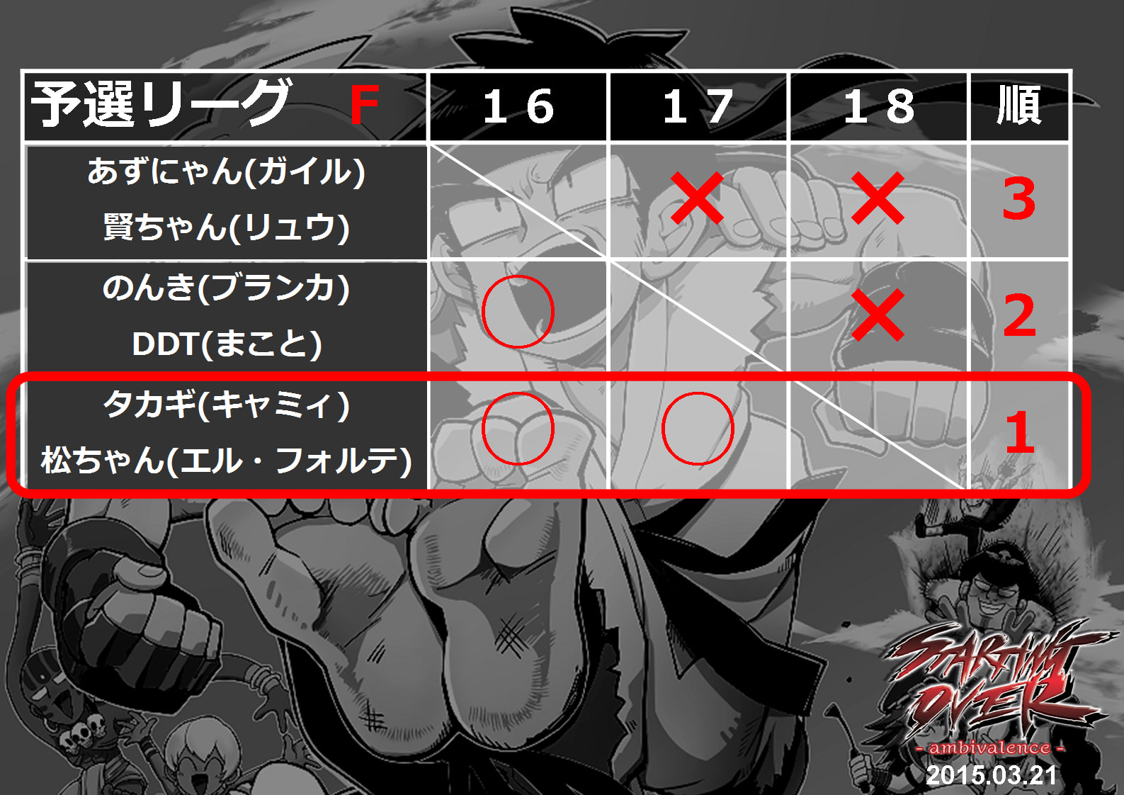 2015/03/21ゲームイベント 2015.03.21 USF4西セガランダム2on2大会 STARTING OVER -ambivalence- トーナメント・リーグ表 予選結果 前の記事へ 次の記事へ