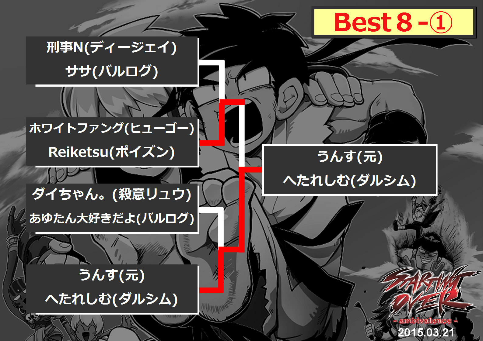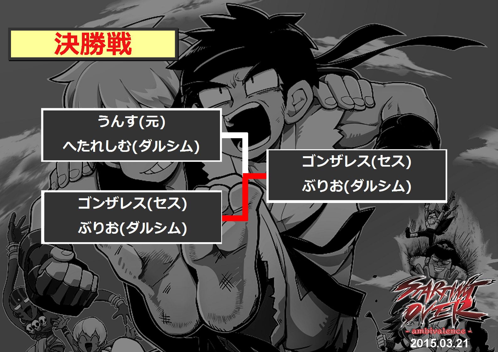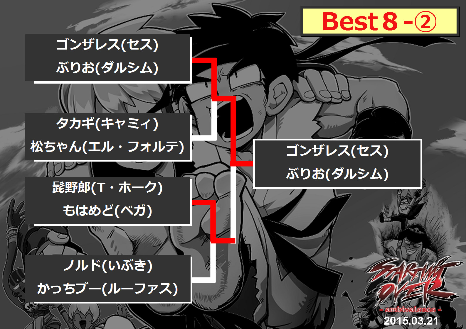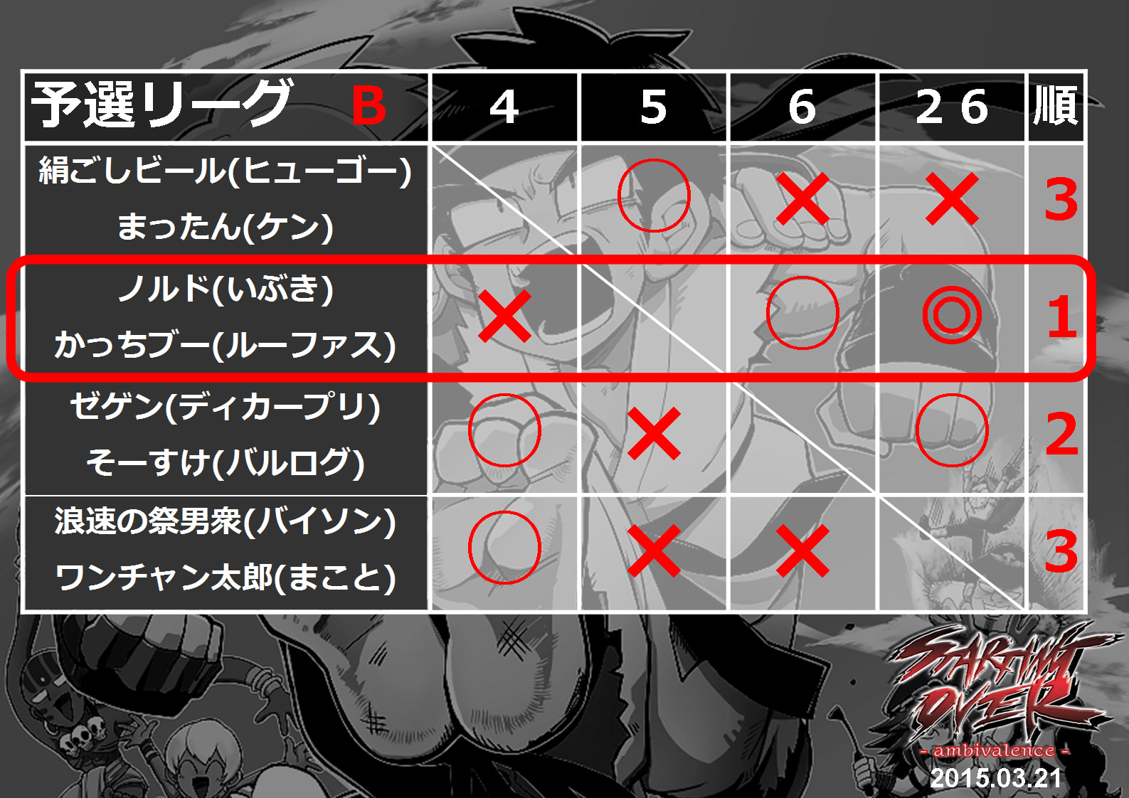 2015/03/21ゲームイベント 2015.03.21 USF4西セガランダム2on2大会 STARTING OVER -ambivalence- トーナメント・リーグ表 予選結果 前の記事へ 次の記事へ
