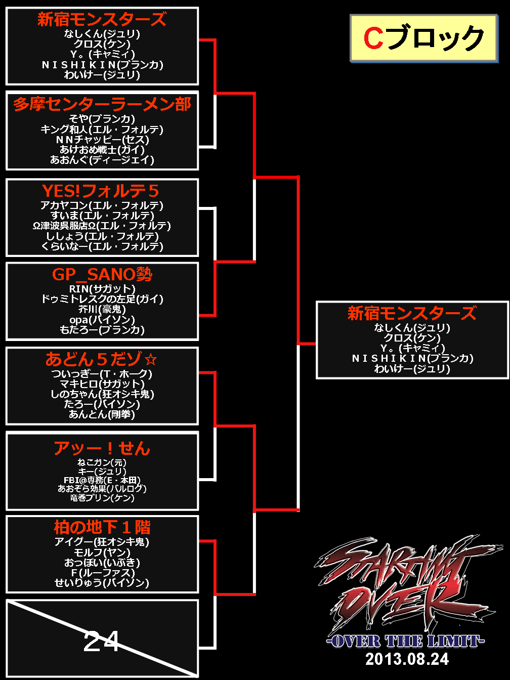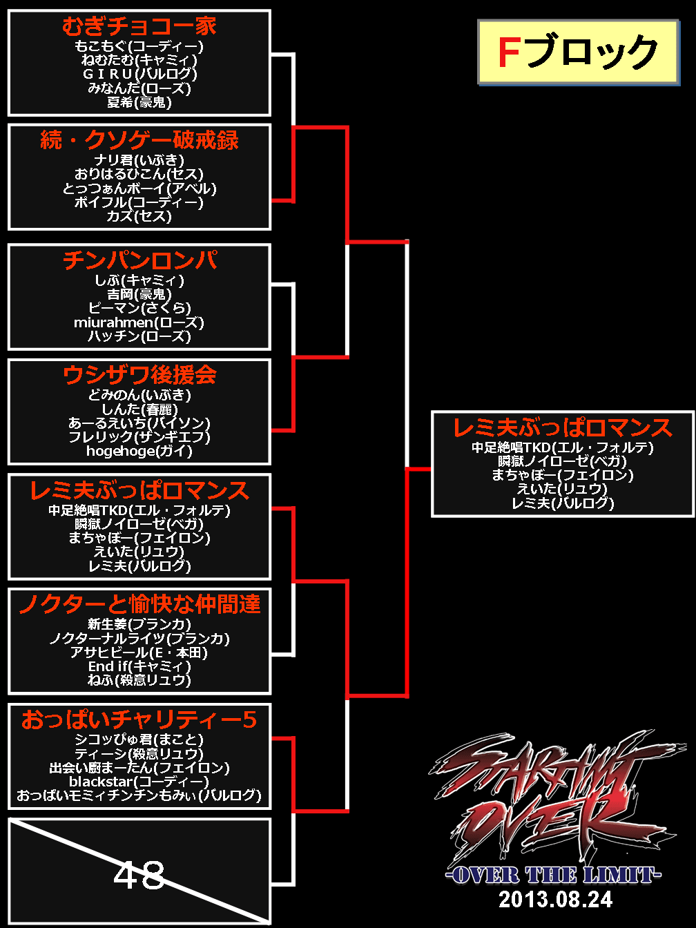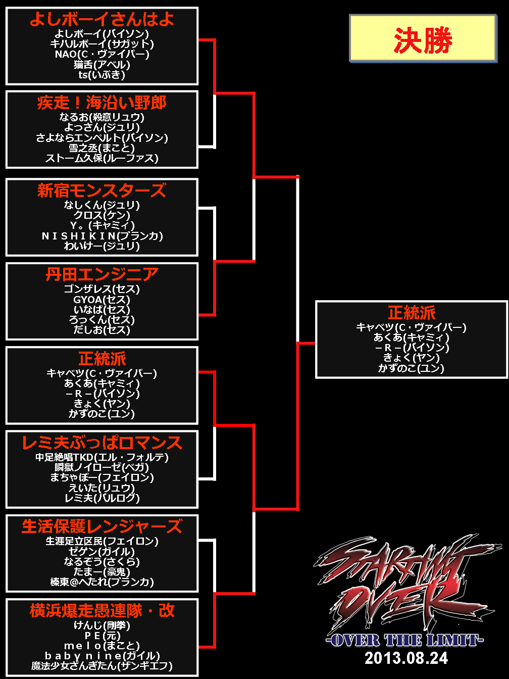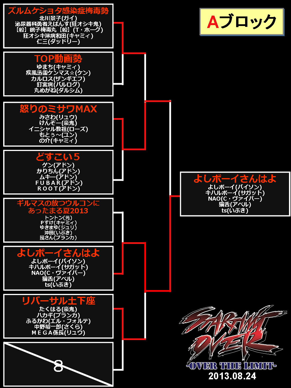 2013/08/26ゲームイベント 【結果】西セガ夏祭り『5on5(8/24)』トーナメント表等 【ニコ生公式放送は終了しました】 ■決勝トーナメント表 (優勝:正統派) (準優勝:よしボーイさんはよ) ■予選トーナメント 前の記事へ 次の記事へ
