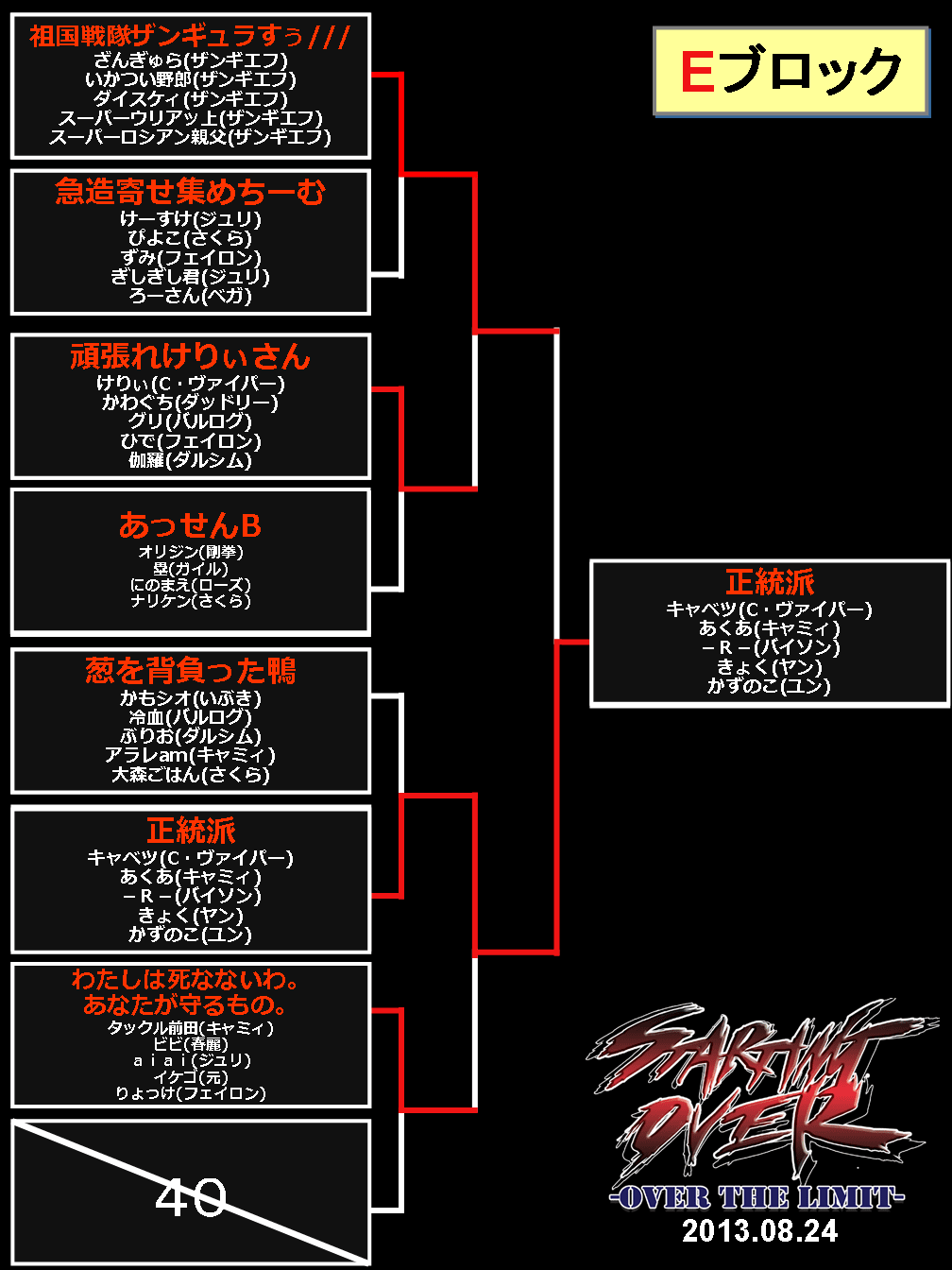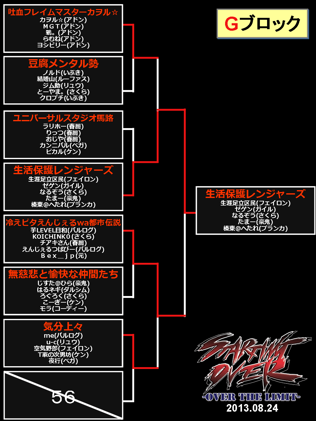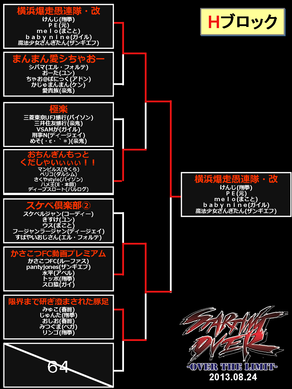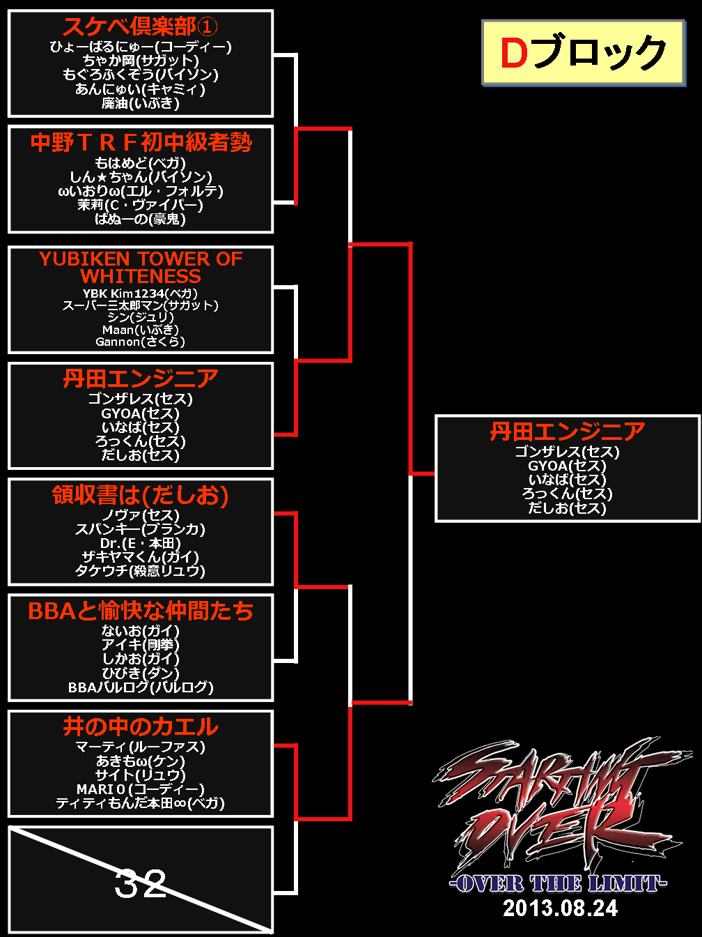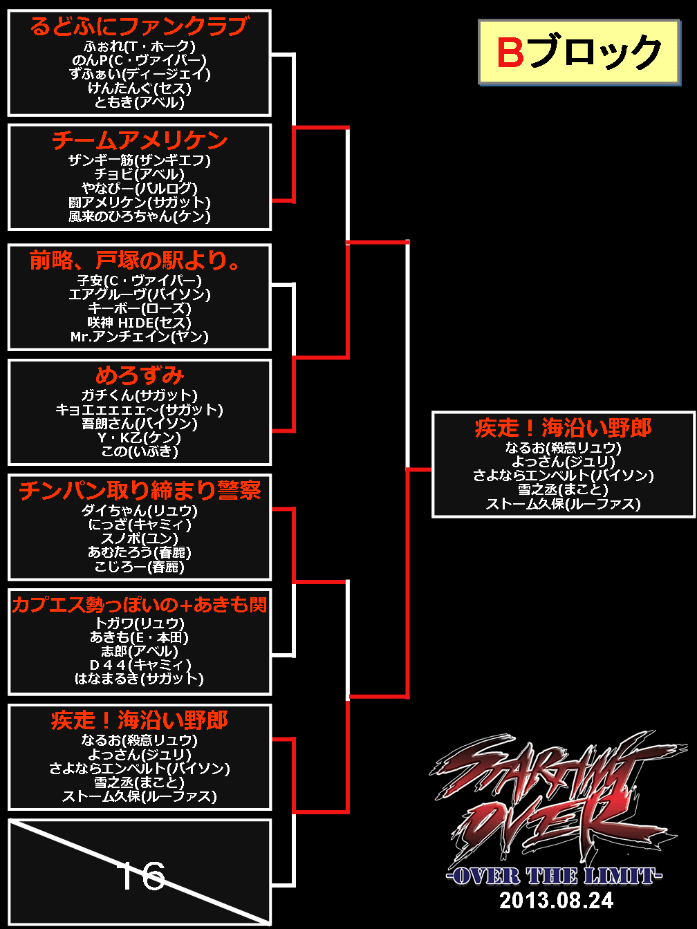 2013/08/26ゲームイベント 【結果】西セガ夏祭り『5on5(8/24)』トーナメント表等 【ニコ生公式放送は終了しました】 ■決勝トーナメント表 (優勝:正統派) (準優勝:よしボーイさんはよ) ■予選トーナメント 前の記事へ 次の記事へ