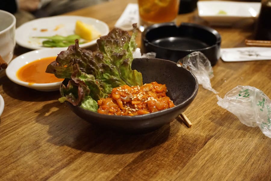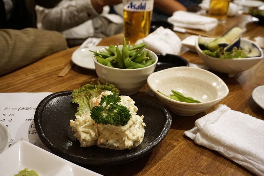 ポテサラ、もつ刺。もつ刺の辛子酢味噌がちょい辛目で食べやすかった。