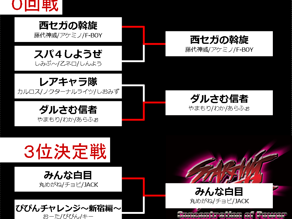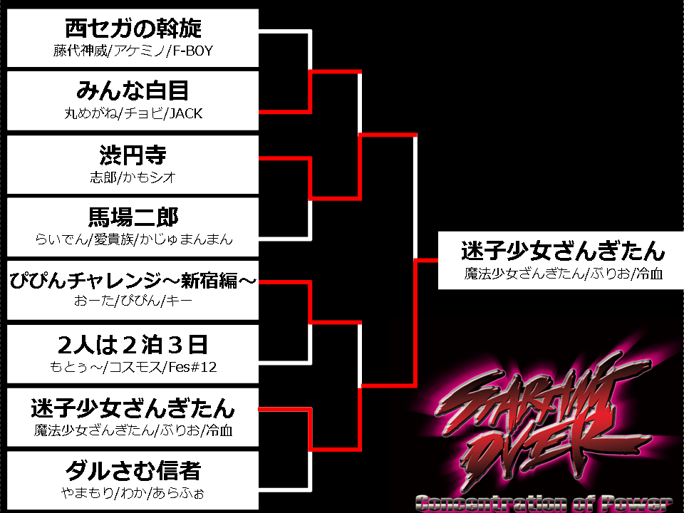 2012/05/04ゲームイベント STARTING OVER ~Concentration of Power~ 新宿予選結果 参加チーム数 10 ゼロ回戦および3位決定戦結果 トーナメント結果 2012.05.04 STARTING OVER 新宿予選 0回戦 2012.05.04 STARTING OVER 新宿予選 1回戦 2012.05.04 STARTING OVER 新宿予選 準決勝 2012.05.04 STARTING OVER 新宿予選 3位決定戦、決勝戦 前の記事へ 次の記事へ