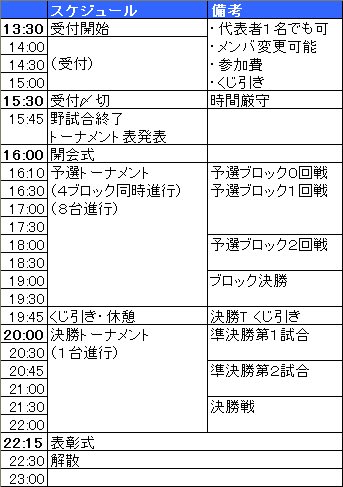 2011/09/12日記 【綾野杯2nd】当日のスケジュールについて 16時以降の予定は大会の進行しだいで前後(特に前倒す方向で)することがあります。 13:30~15:30 :受付 16:00~16:10 :開会 16:10~19:45 :予選トーナメント開始(4ブロック同時。8台使用) 19:45~20:00 :休憩、抽選 20:00~22:15 :決勝トーナメント開始(1台のみ) 22:15~22:30 :表彰式。閉会。 前の記事へ 次の記事へ