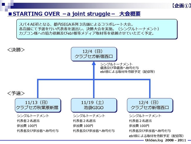 2011/12/04日記 【大会告知】SSF4AE 都内セガ店舗合同大会について 各大会とも、当日受付10:00~ 受付終了 13:30 配信URLはコチラ トーナメント表作成中 ■特別称号 決勝大会 優勝:闘仙 秋葉原予選 優勝:研摩 池袋予選 優勝:練武 新宿予選 優勝:探求者 前の記事へ 次の記事へ